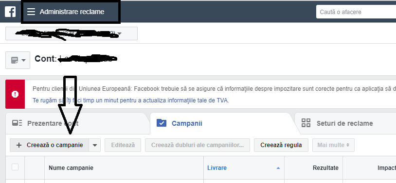 Pas 1# Intri în Ads Manger – Creează o campanie – Alegi obiectivul Generare de Clienţi Potenţiali – Denumeşti Campania – Continuă.