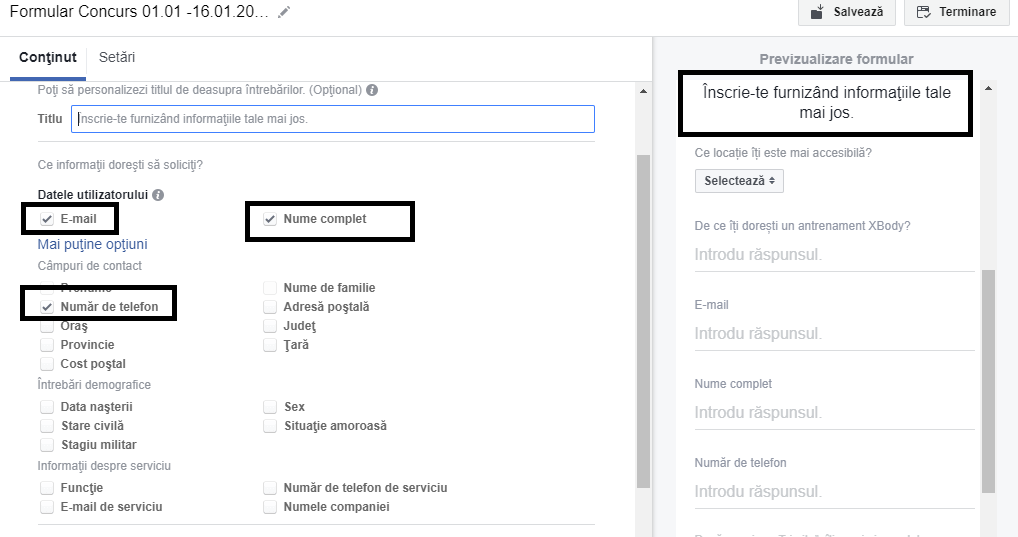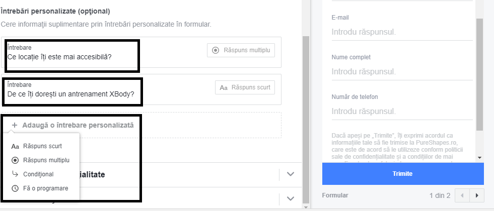 Pas #12: De asemenea, poţi adăuga şi întrebări personalizate pentru a afla cât mai multe date despre lead-urile tale. Eu am ales o întrebare cu variante de răspuns ce vizau locaţiile businessului şi pentru a obţine lead-uri calificate, am ales să adaug şi o a doua întrebare referitoare la motivul pentru care îşi doresc un antrenament XBody. Adăugarea unei întrebări noi se face foarte simplu, prin apăsarea opţiunii Adaugă o întrebare personalizată. Eu am ales răspuns scurt şi multiplu pentru cele 2 întrebări.