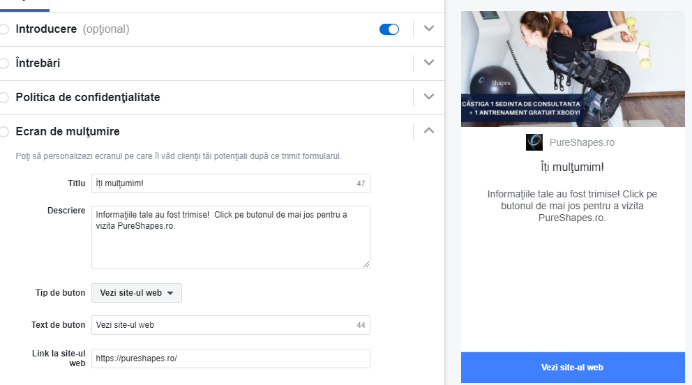 Pas #14: Ecran de mulţumire – Aici se adaugă de regulă un text prin care se mulţumeşte pentru înregistrare şi se adaugă un buton cu site-ul web pentru mai multe informaţii.