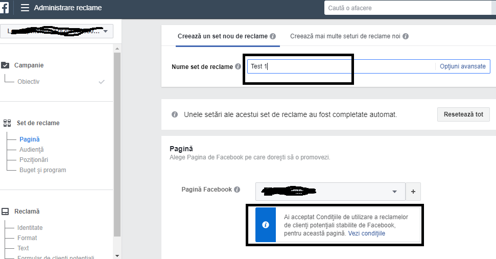 Pas#2: Denumeşti Ad Set-ul – Accepţi condiţiile de utilizare a reclamelor de clienți potențiali stabilite de Facebook