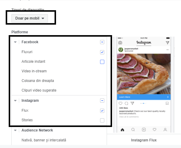 Pas #4: La poziţionări, recomand să editezi plasamentele şi să bifezi doar Fuxuri pe Facebook, eventual şi Instagram dacă ştii că în trecut ai obţinut vizite şi conversii din acest canal. La fel şi în cazul dispozitivelor, recomand să selectezi doar dispozitive mobile. Analizând campaniile anterioare peste 90% din lead-uri accesau ad-ul de pe mobil.