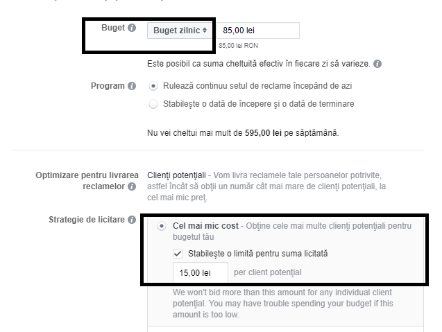 Pas #6: Îţi setezi o strategie de licitare. Pentru a te asigura că ad-urile îţi vor fi livrate, impactul va fi unul ok iar bugetul se va consuma, indicat ar fi să faci o licitare manuală şi să stabileşti o limită pentru suma licitată. Facebook îţi va livra o sumă, by default. Poţi să stabileşti un cost mai mic decât cel indicat iar în funcţie de performanţe, poţi jongla.