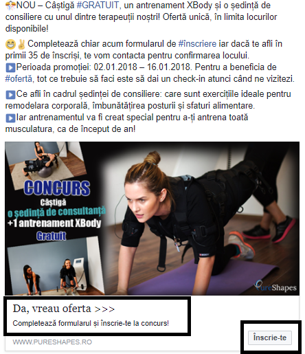 Pas #8: Adaugi textul, headline-ul şi descrierea. Un exemplu de ad creat de mine într-o campanie de Lead Generation a fost pentru înscrierea la 1 antrenament gratuit XBody şi o şedinţă de consultanţă: