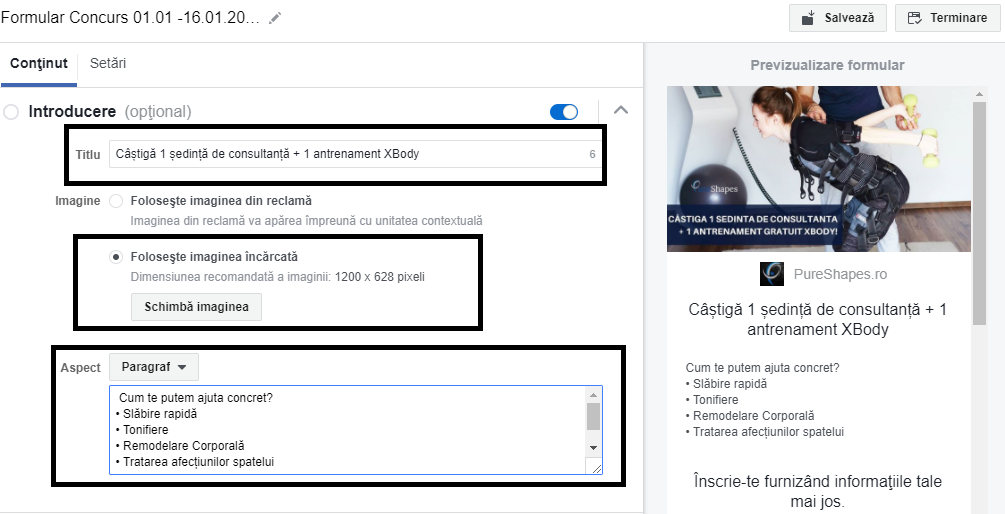 Pas #10: Construirea formularului este una foarte simplă: În Introducere adaugi un titlu, poţi încărca o imagine de prezentare și poţi adăuga informaţii utile despre serviciul pe care îl oferi. Aici poți găsi specificațiile de design pentru reclamele de clienți potențiali de pe Facebook și Instagram.
