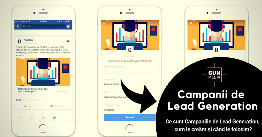 Când unui lead îi apare reclama în News Feed şi dă click, se deschide un formular precompletat cu numele (Profilul de Facebook) şi nr. de telefon iar în funcţie de obiectivul tău (ca și promotor), poţi adăuga câmpuri prin care ceri furnizarea adresei de mail  sau răspunsuri mai complexe care să te ajute să le oferi clienţilor tăi cele mai bune servicii în funcţie de nevoile lor.