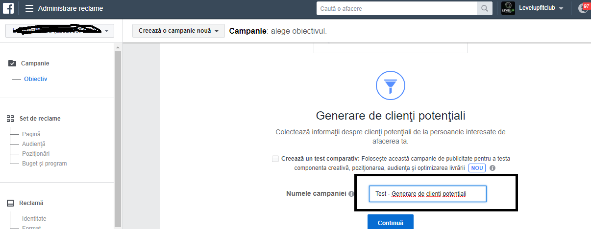 Pas 1# Intri în Ads Manger – Creează o campanie – Alegi obiectivul Generare de Clienţi Potenţiali – Denumeşti Campania – Continuă.