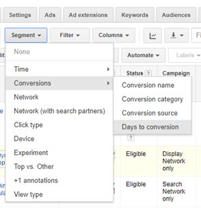 In ambele interfate AdWords, regasesti noul segment in Segment – Conversions – Days to conversion la nivel de campanii, grupuri de anunturi si cuvinte cheie.