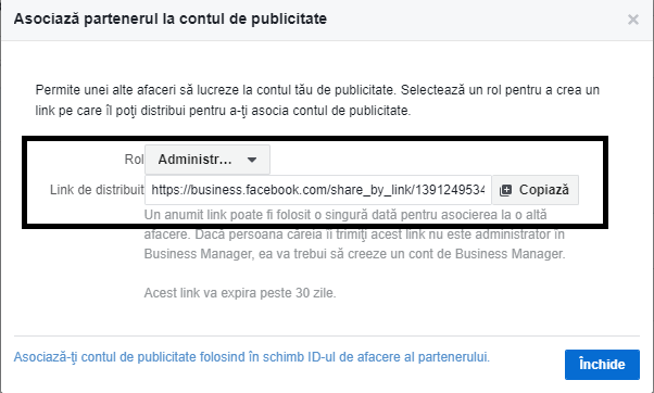 Conturi de publicitate – Îţi alegi contul – Atribuie un partener – Alegi rolul pe care vrei să i-l atribui agenţiei (de regulă de administrator) – şi se generează un link pe care îl trimiţi mai departe consultantului tău Social Media.