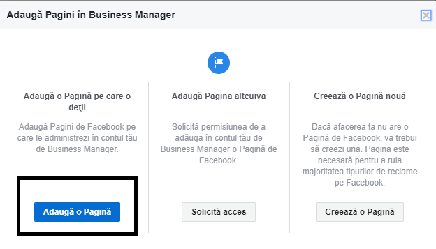 1. Pentru a adăuga o pagină pe care o administrezi (ex: Pagina de Facebook a businessului tău), apasă pe Adaugă o pagină – Adaugă o pagină pe care o deţii – şi introdu URL-ul paginii. Dacă eşti administrator al paginii, cererea îţi va fi aprobată automat.
