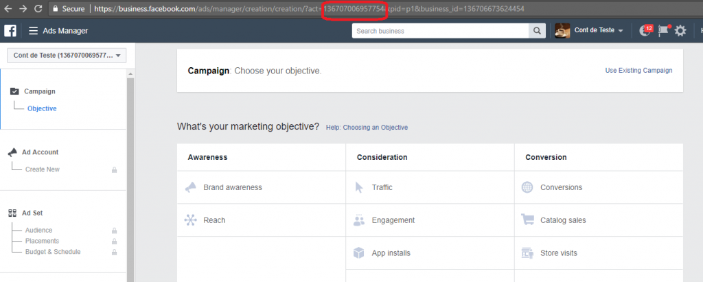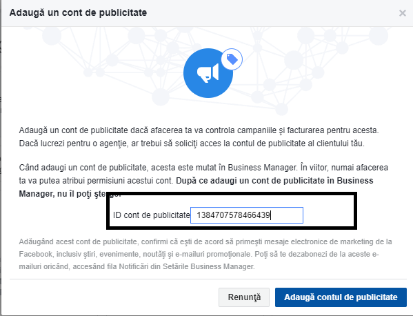 2. Pentru a adăuga un cont de publicitate (presupunând că ai mai făcut campanii pe Facebook şi ai deja un cont de Facebook Ads), tot ce trebuie să faci este să apeşi pe Adaugă Contul de Publicitate şi să introduci ID-ul contului. Id-ul se poate vedea în link, atunci când intri în Ads Manager.