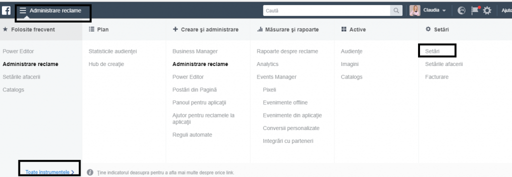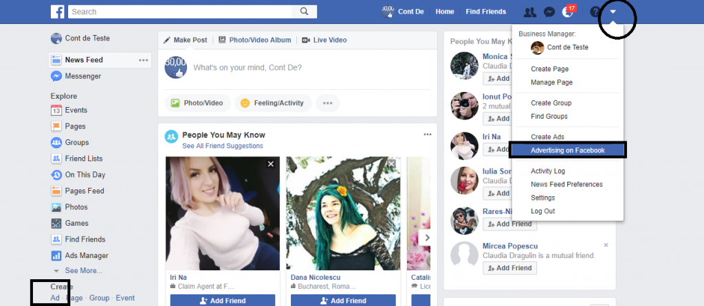 Acum că ai dat acces la pagina de Facebook, mergem mai departe la contul de Facebook Ads. Dacă nu ai un cont de Business Manager, din News Feed, apeşi pe opţiunea Advertising on Facebook sau Administrează reclame (dreapta sus) sau Create Ad/ Creează reclame (stânga jos).