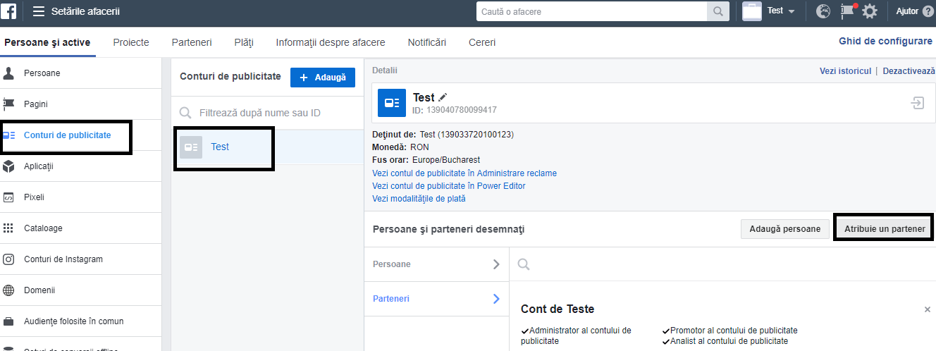 Conturi de publicitate – Îţi alegi contul – Atribuie un partener – Alegi rolul pe care vrei să i-l atribui agenţiei (de regulă de administrator) – şi se generează un link pe care îl trimiţi mai departe consultantului tău Social Media.