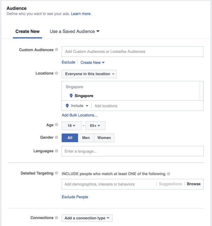 Conexiuni – poți targeta persoane care sunt conectați la pagina ta (i-au dat Like), la aplicație sau eveniment.