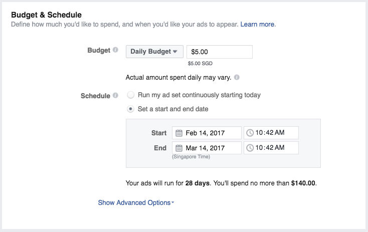 Pentru buget ai două variante: un buget zilnic sau un buget pentru întreaga perioadă. Bugetul zilnic reprezintă suma pe care o va consuma reclama ta zilnic, în medie. Bugetul pe întreaga perioadă reprezintă suma totala pe care o vei consuma de-a lungul timpului.