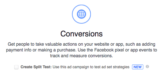 Alegând acest obiectiv vei aduce conversii în site-ul sau aplicația ta. Asemănător cu obiectivul de App Installs, poți face și în acest caz A/B testing.