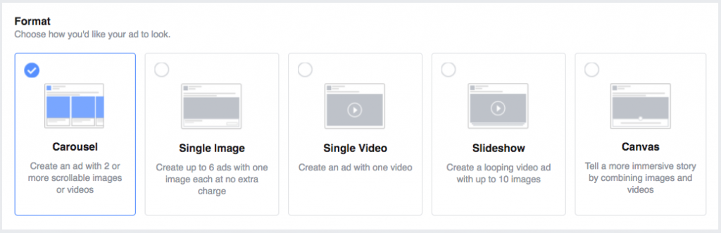 Acum că ai selectat bugetul, audiența și locul de afișare ești gata să creezi ad-ul tău care să ruleze pe Instagram. Există 6 formate disponibile pentru Instagram Ads – patru pentru Feed-ul Instagram și două pentru Instagram Stories.