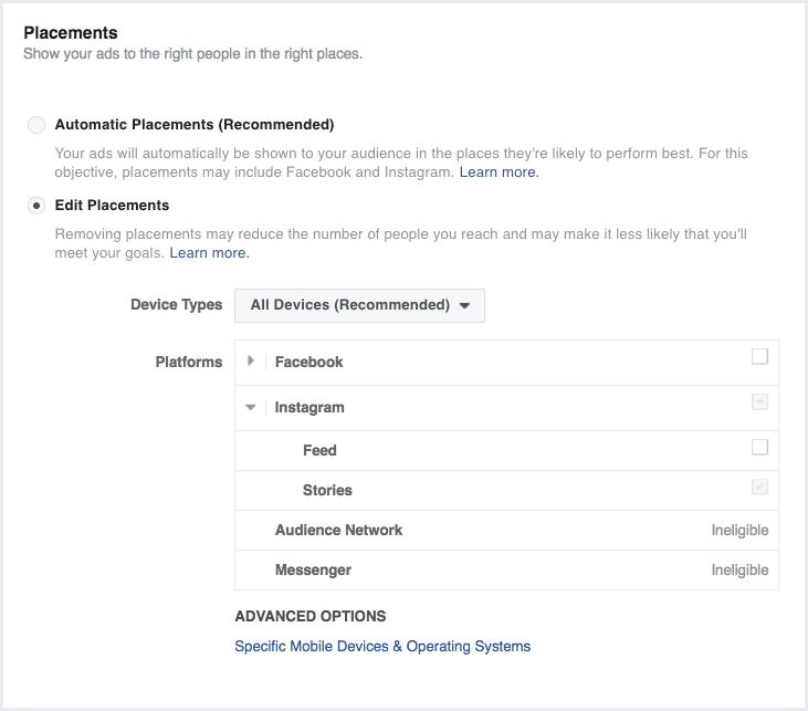 Acesta este un pas foarte important dacă vrei ca ad-urile tale să apară doar pe Instagram, și nu pe Facebook. Va trebui să selectezi „Edit Placements” și să deselectezi tot ce ține de Facebook sau „Audience Network”.