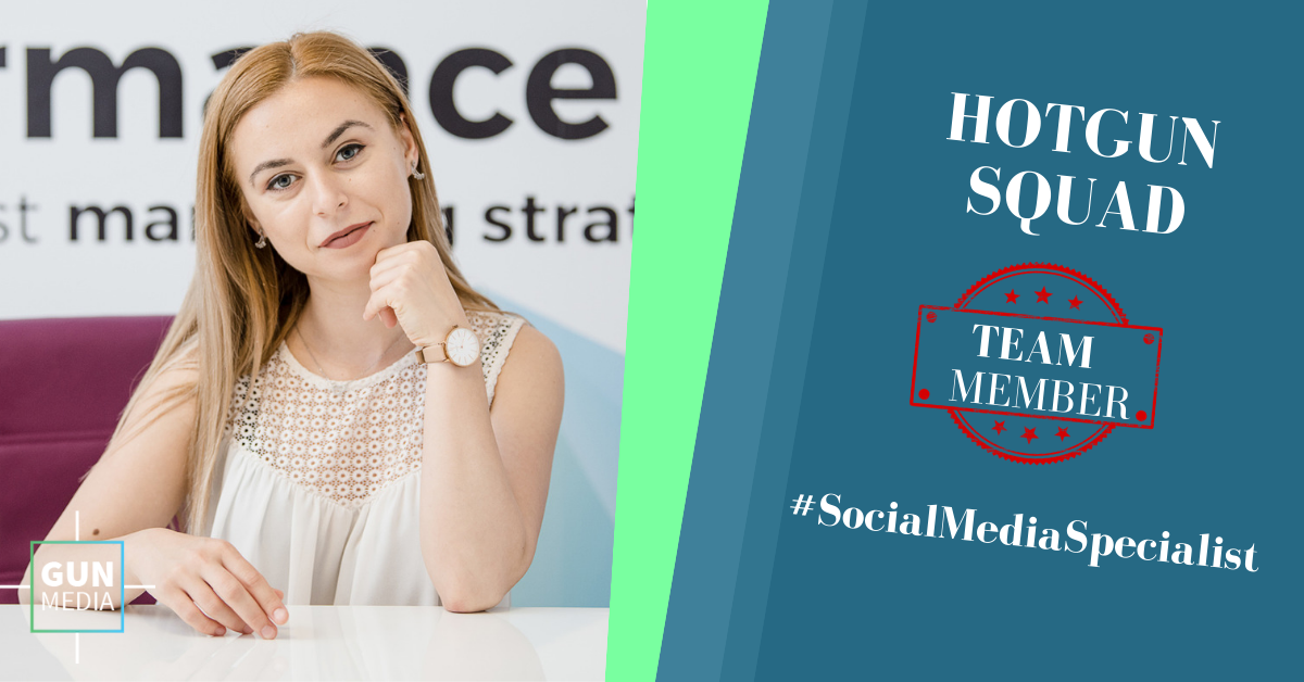 Îmi place să călătoresc, ador să mă uit la seriale (primul serial care i-a venit în minte a fost Peaky Blinders). Chiar dacă nu am spus-o prima, pasiunea mea de peste 6 ani este sportul. A început ca o joacă, apoi ca un job, iar ulterior m-a ghidat către marketing. Cumva s-au legat lucrurile. Inițial am intrat pe un job de recepție într-o sală de fitness, ulterior am reușit să preiau partea de marketing (newslettere, postări în Social Media, Facebook Ads, articole de blog). Așa am descoperit că îmi place partea de Social Media marketing și m-am gândit cum ar fi să lucrez pentru mai multe branduri în același timp și să văd ce se întâmplă și în alte conturi, pe alte nișe. Așa am ajuns să lucrez la Gun.